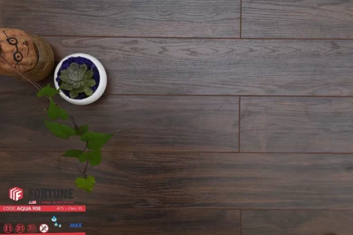 - Bền bỉ: Lõi gỗ HDF chắc chắn, kết hợp công nghệ ép, lớp phủ chống thấm và hệ thống khóa đan chặt chẽ giúp tăng độ bền cho sàn gỗ. Sàn gỗ Fortune Aqua 908 có độ bền cao, ít biến dạng theo thời gian.
