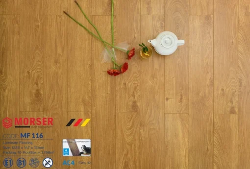 - Sàn gỗ Morser MF116 được sản xuất từ nguyên liệu gỗ HDF E1 siêu cứng, nhập khẩu từ nước ngoài.