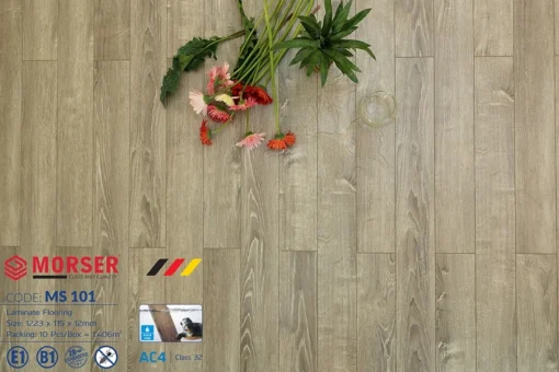 • Sàn gỗ Morser MS101 được sản xuất từ nguyên liệu gỗ HDF E1 siêu cứng, nhập khẩu từ nước ngoài.